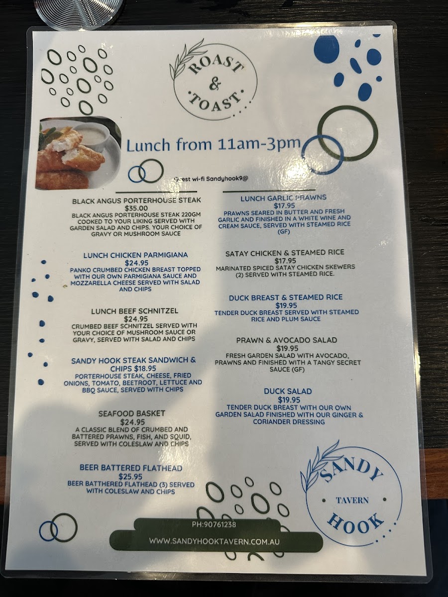 - Seafood: The menu features items like Beer Battered Flathead, Seafood Basket, and Lunch Garlic Prawns.